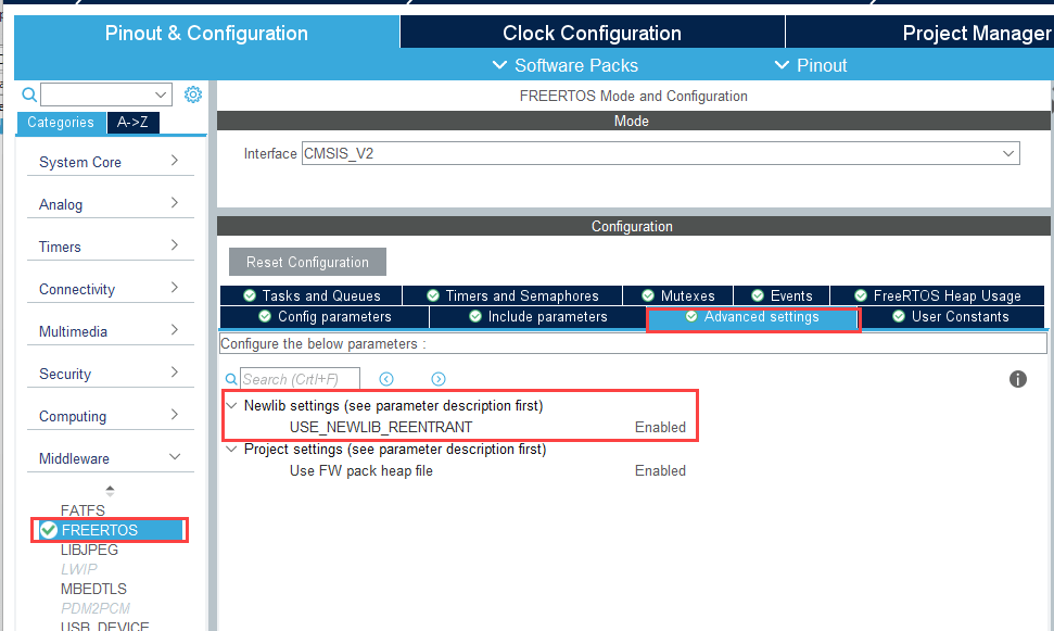 6. Set USE_NEWLIB_REENTRANT to Enabled in STM32CubeMX > Middleware > FREERTOS > Advanced settings > Newlib settings.