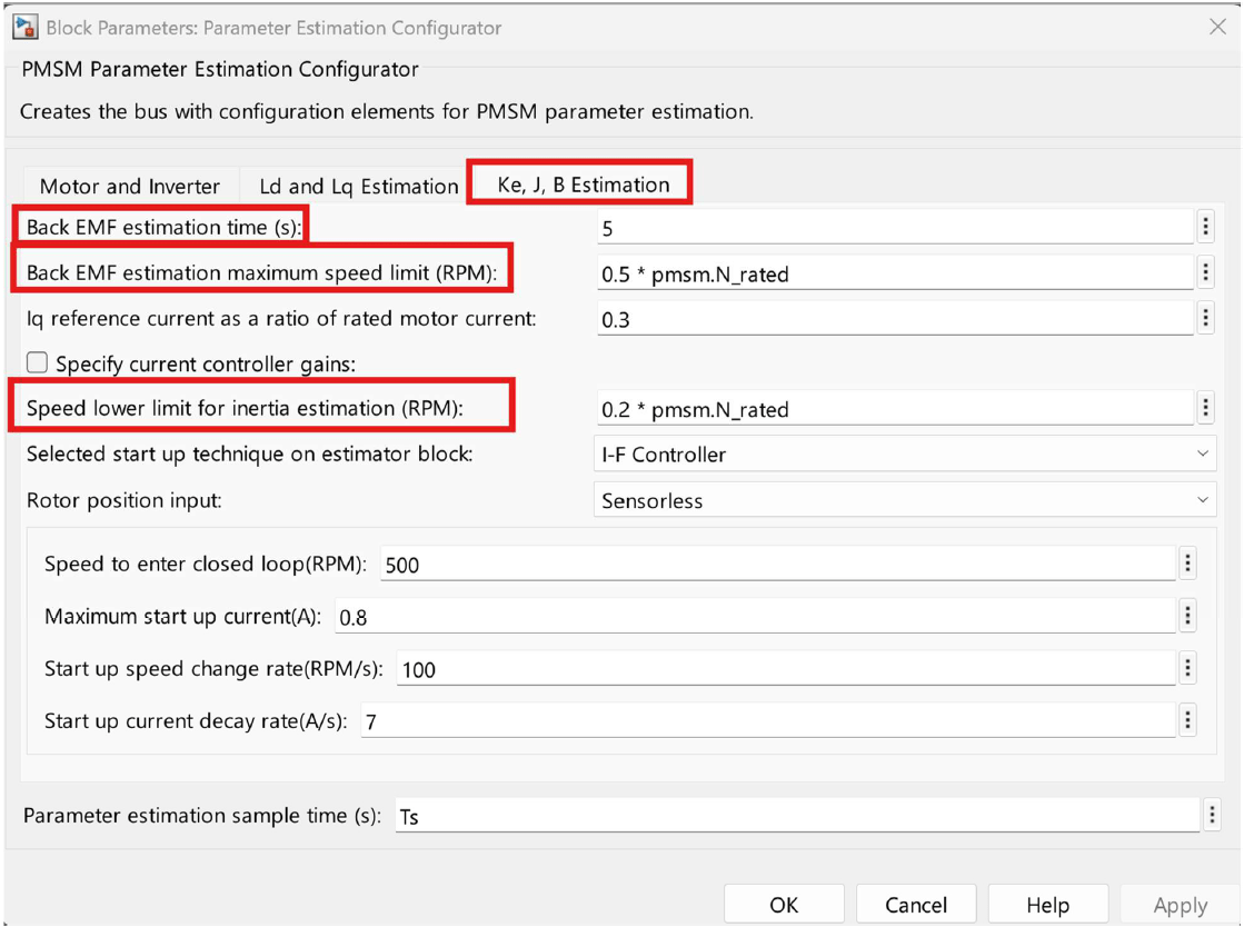 2. Review and update parameters in the Ld and Lq Estimation and Ke, J, B Estimation tabs to match your application requirements.