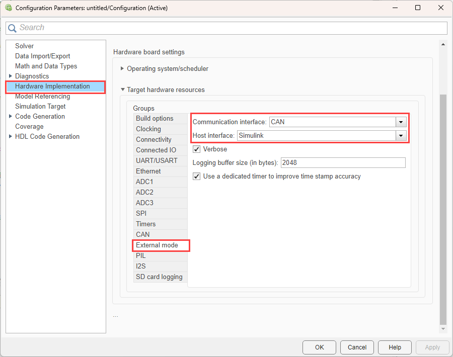 1. Open the Modeling tab and press CTRL+E to open the Configuration Parameters dialog box. Go to Hardware Implementation > Target Hardware Resources > Build options.
