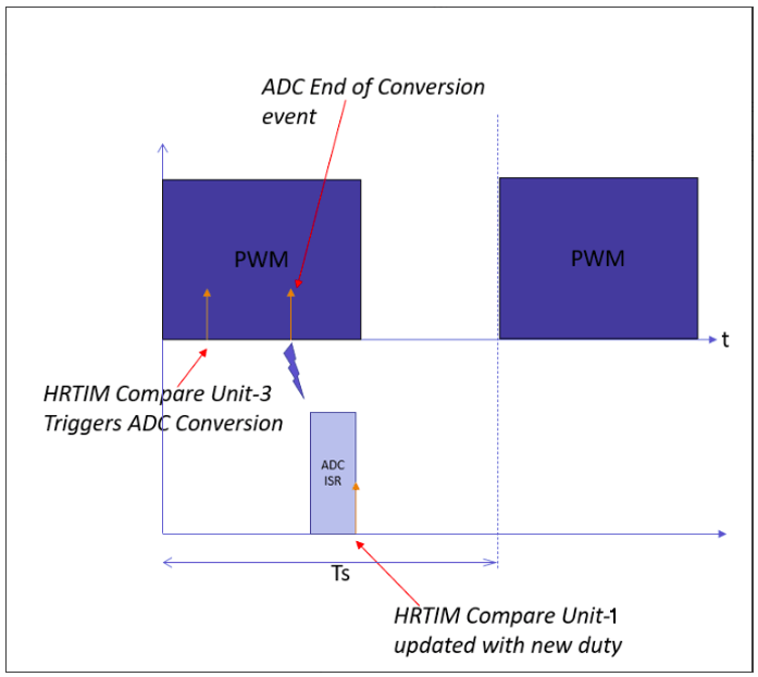 The sampling of the ADC module is triggered by the HRTIM module, in this case by comparing unit 3, which is set to a number of HRTIM ticks after the beginning of the switching period to avoid switching noise corrupting the sample. Once the sampling and conversion are complete, the ADC triggers the end of conversion interrupt to the CPU. Within this ISR the PI controller can compute the correction duty and update the HRTIM compare unit 1. The new duty applies from the next switching cycle of the PWM.