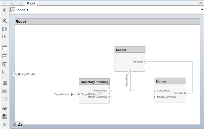 El nivel de raíz del modelo de arquitectura también puede tener puertos que describen la interacción del sistema con su entorno. En este ejemplo, la posición objetivo del robot la proporciona un equipo externo al propio robot. Represente esta relación con un puerto de entrada.