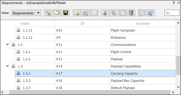 Select components on the model to see the requirement they link to, or, conversely, select items in the Requirements view to see which components implement them. Requirements can also be linked to connectors or ports to allow traceability throughout your design artifacts. To edit the requirements in smallUAVReqs.slreqx, select the Requirements Editor (Requirements Toolbox) from the menu.