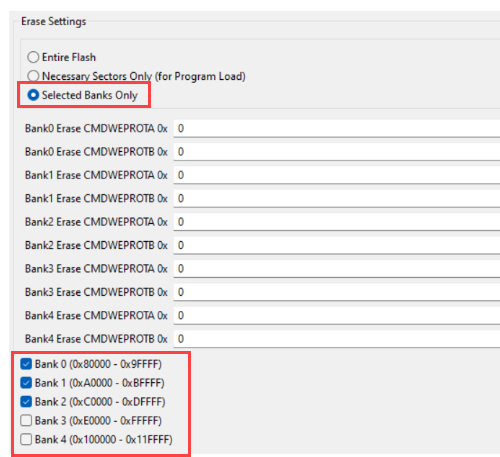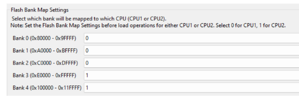 Similarly to steps 3 and 4, in the CPU2 flash plugin GUI, map Bank 0-2 to CPU1 and map Bank 3 and 4 to CPU2. Additionally, under Erase settings, enable Bank 3 and Bank 4 to allow them to be erased by the flash plugin for CPU2.