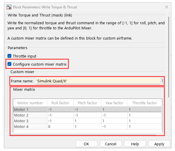 To simulate and control your custom multicopter using Simulink, you need to configure the model with the appropriate mixer settings and airframe parameters. This section guides you through how to set up the Write Torque & Thrust block, select the correct airframe, and prepare for simulation and testing using Mission Planner.