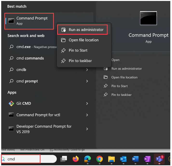 • Type cmd in Windows search, and right-click on the command prompt entry and select Run as administrator.