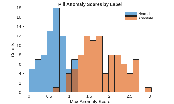 numBins = 20; figure [~,edges] = histcounts(scoresCal,numBins); hold on hNormal = histogram(scoresCal(labelsCal==0),edges); hAnomaly = histogram(scoresCal(labelsCal==1),edges); hold off legend([hNormal,hAnomaly],"Normal","Anomaly") xlabel("Max Anomaly Score") ylabel("Counts") title("Pill Anomaly Scores by Label")