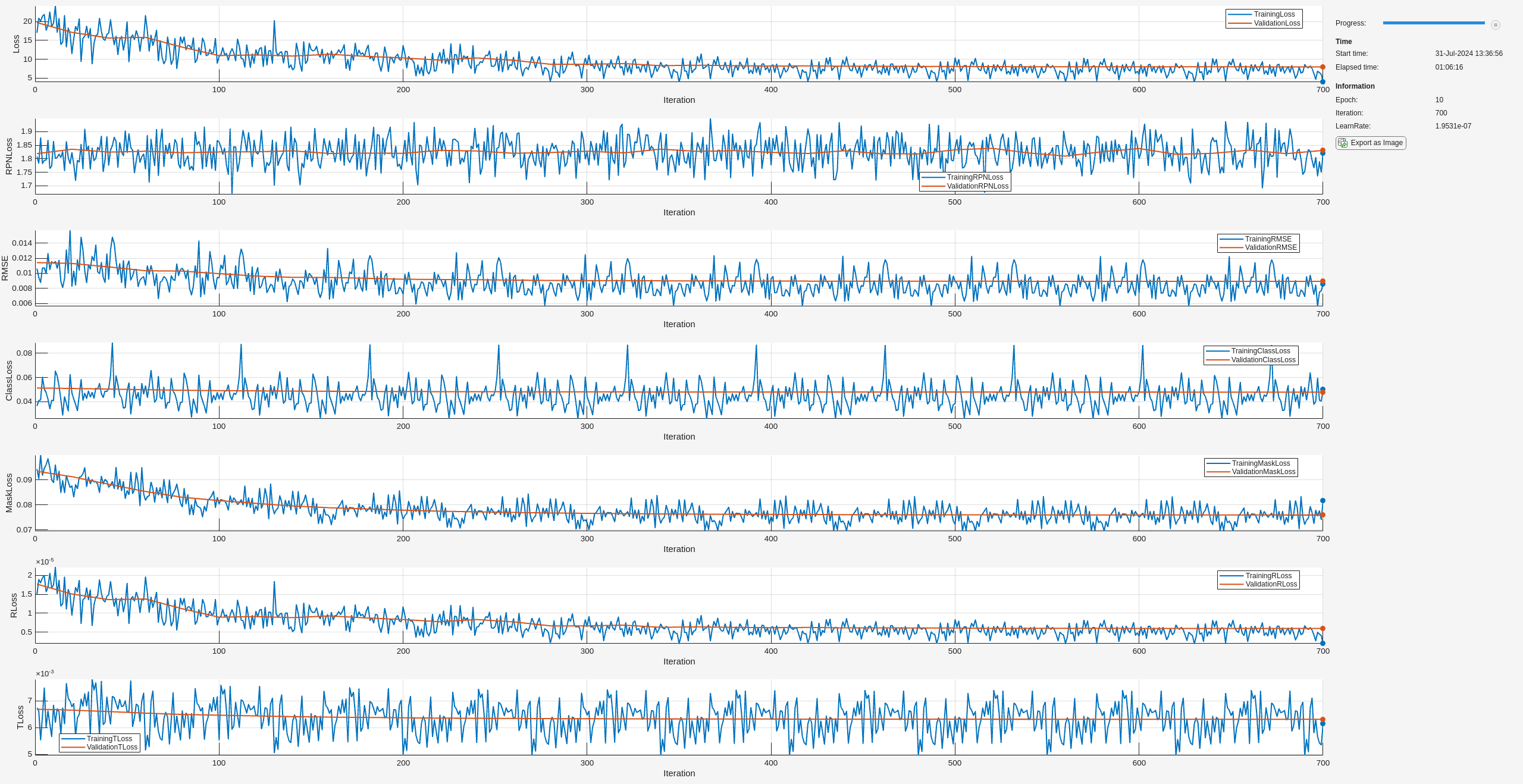 if doTrain trainedNet = trainPoseMaskRCNN(... dsTrain,net,"mask-and-pose",optionsStage2); modelDateTime = string(datetime("now",Format="yyyy-MM-dd-HH-mm-ss")); save(fullfile(outFolder,"stage2trainedPoseMaskRCNN-"+modelDateTime+".mat"),"trainedNet"); disp(fullfile(outFolder,"stage2trainedPoseMaskRCNN-"+modelDateTime+".mat")) end