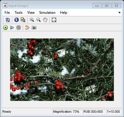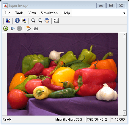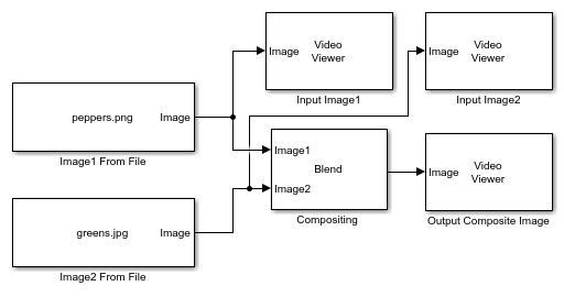 This model reads two input images using Image From File blocks with their File name parameters set to peppers.png and greens.jpg, respectively.
