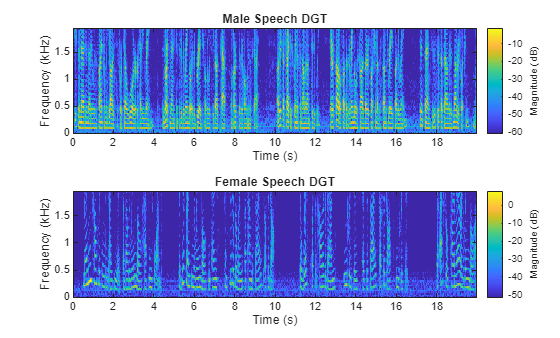 figure tiledlayout(2,1) nexttile dgt(mSpeech, ... SampleRate=Fs, ... WindowLength=winLen, ... HopLength=winLen-overlapLen, ... NumFrequencyBins=numBin, ... FrequencyRange=frqRng) title("Male Speech DGT") nexttile dgt(fSpeech, ... SampleRate=Fs, ... WindowLength=winLen, ... HopLength=winLen-overlapLen, ... NumFrequencyBins=numBin, ... FrequencyRange=frqRng) title("Female Speech DGT")