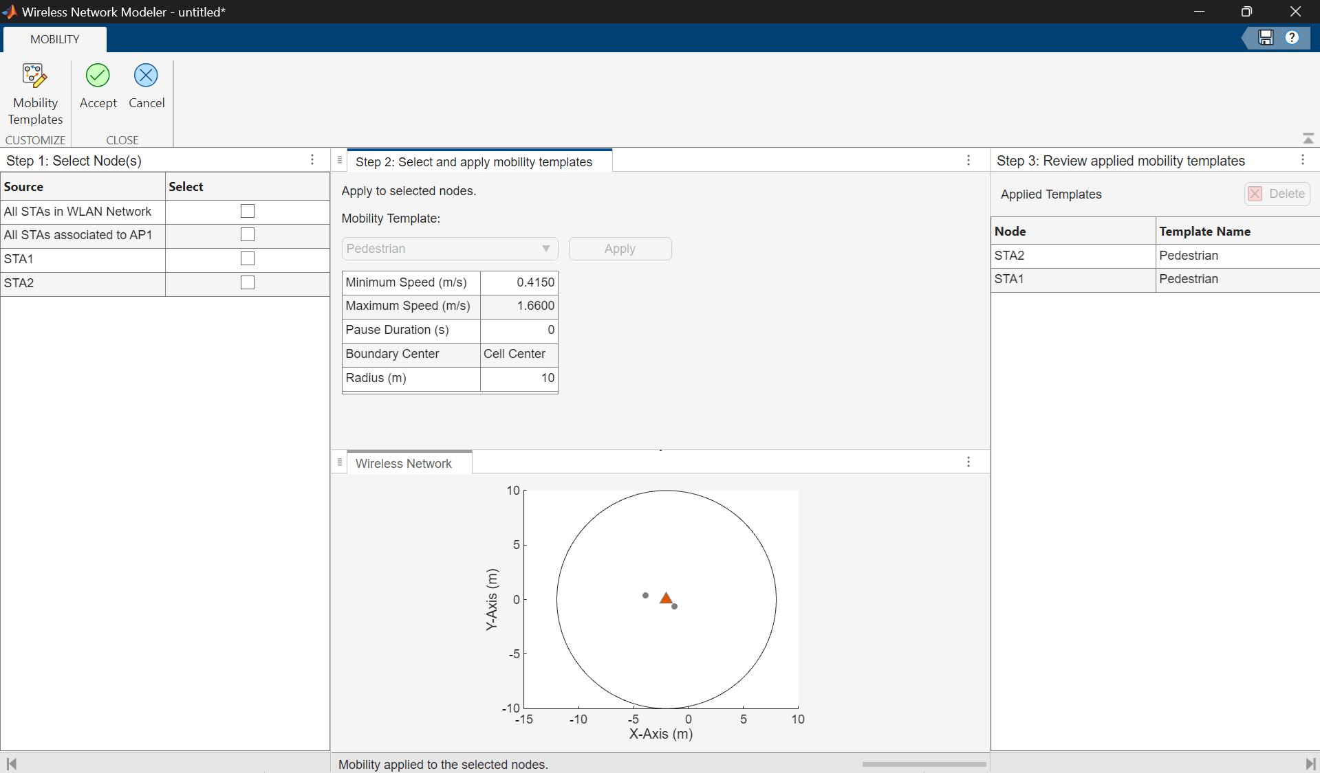 Random walk and constant velocity mobility models. Currently, the app supports only random waypoint mobility model with these configuration options: speed range, pause duration, and radius.
