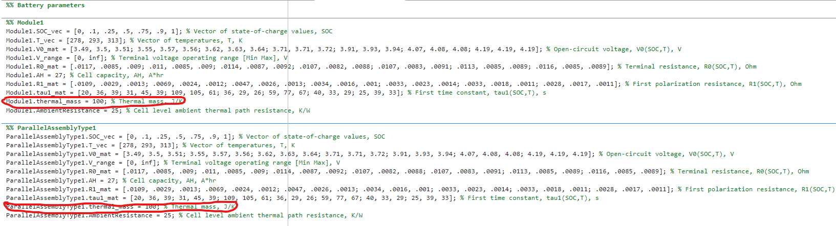 I have generated a battery module of 196 cylindrical cells arranged in an array of 14 series connected parallel assemblies each having 14 cells with thermal effects using the buildBattery command in MATLAB Simscape R2022b. On observing the battery pack parametrization file I realized that the thermal mass is mentioned both in the ParallelAssmebly section as ParallelAssemblyType1.thermal_mass and in the Module section as Module1.thermal_mass. My doubt is, do these parameters represent cell level parameters or the ParallelAssembly and Module respectively. That being said, does one need to manually calculate the thermal mass for the whole system and input the value in the paramtere file or does the program calculate it for the whole module/ battery pack from the cell level during the simulation? Does this factor then also apply to other paramters in the Module and Parallalel Assembly section of the parameter file?