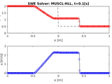 Solves the one-dimensional shallow water equations (SWE) for any initial condition, such as a dam break scenario, using a second-order MUSCL-LF, MUSCL-Rusanov and MUSCL-HLL implementations. This snippet includes an exact solver for Riemann problems of the SWE.